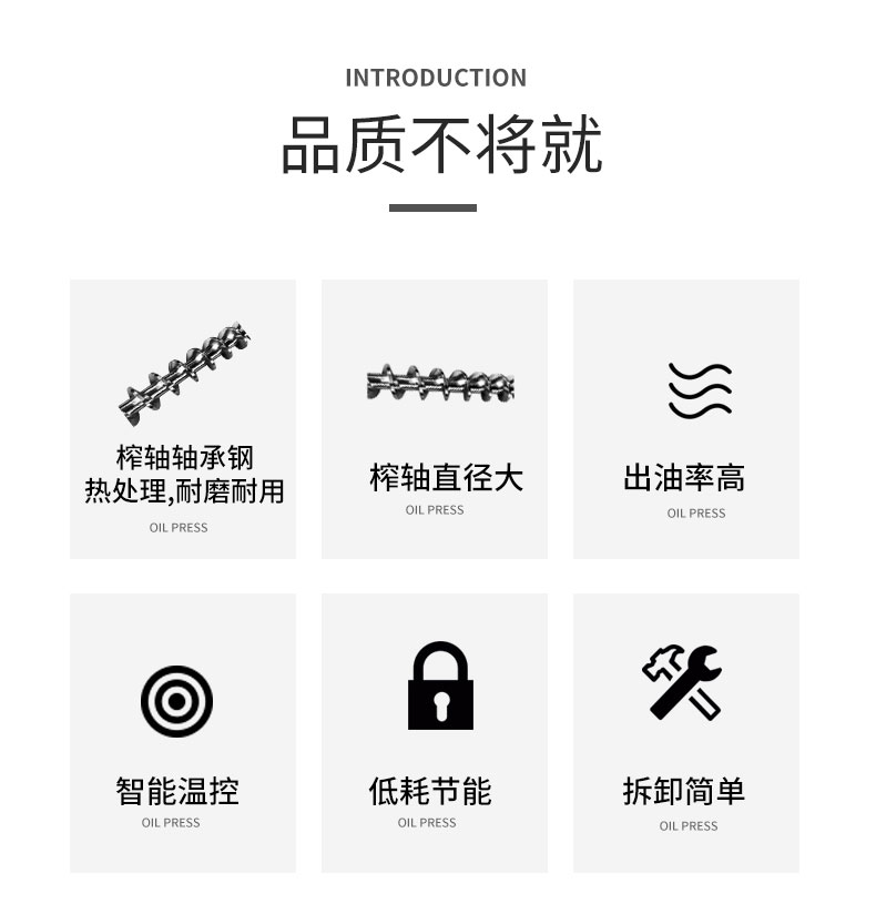 适合压榨油料:芝麻、菜籽、葵花籽、花生等多种原料