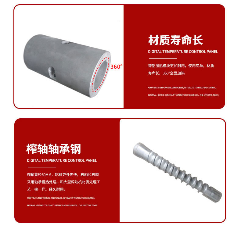 3:榨轴直径50mm,吃料更多更快,材质为轴承钢,热处理。更耐用耐磨。